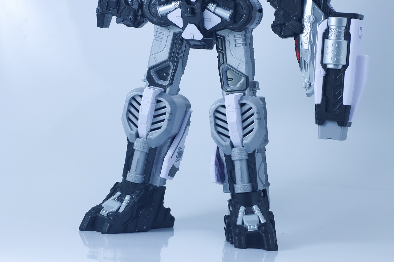 次はコスモギャバリオン GC-Rへの変形です。のちほど紹介しますがジマンゲーダGC-Rのエモルギアを装填すると合体待機音が発動します。それが鳴っているうちに変形させていきます。まずは後部の脚を展開。
