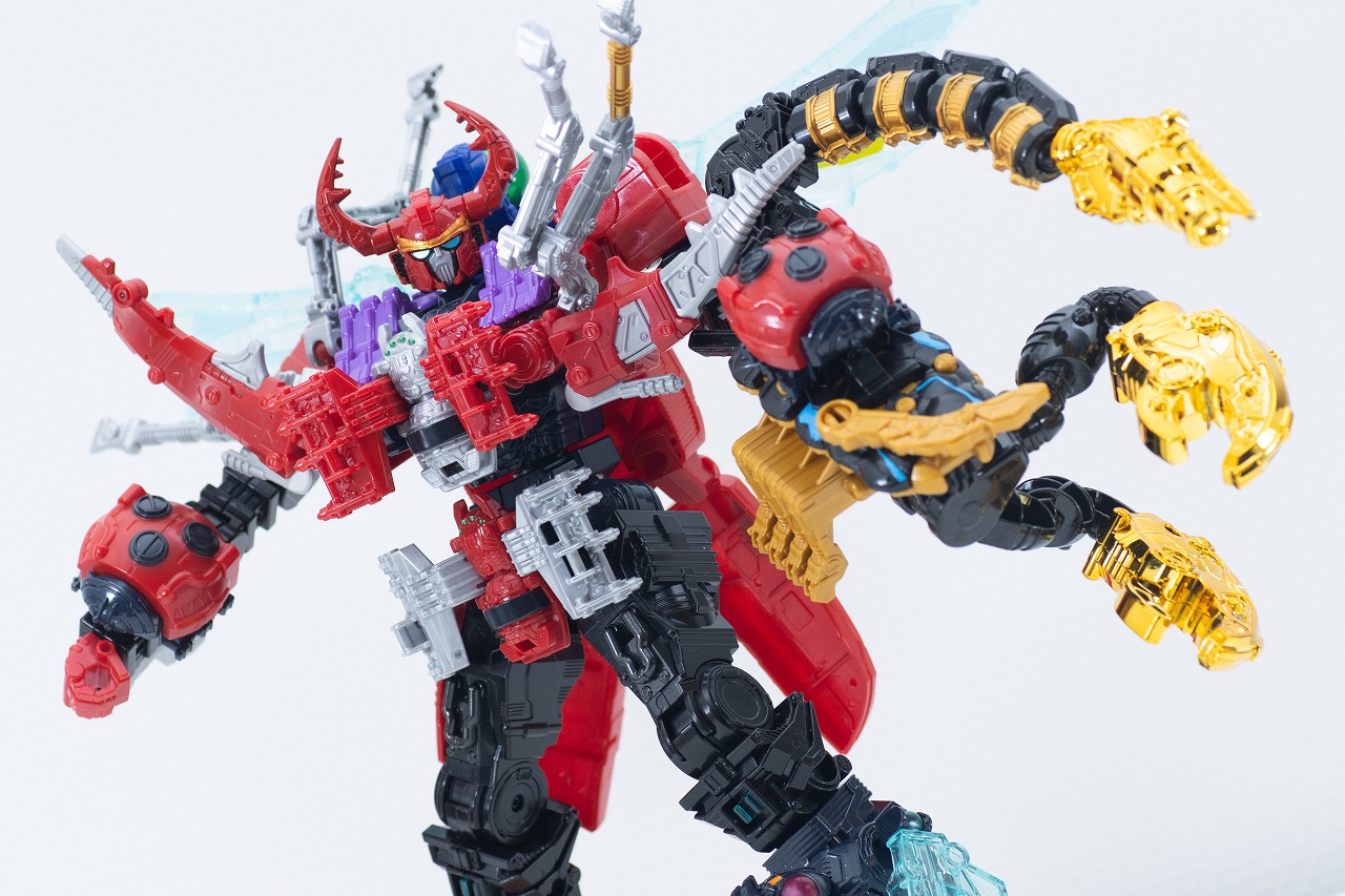 造形周りは申し分なかったですね。もちろん玩具がベースで劇中に登場しているのもありますが、しっかりと目かなサソリでかっこよかったです。またしっぽとハサミのメッキも非常に素晴らしいところでした。しっぽのアクションも気持ちの良いバウンドなのでクセになりそうです。合体ギミックについてもそこまで難しいものではなかったです。全体的にも遊びやすいゴッドスコーピオンとなっていました。