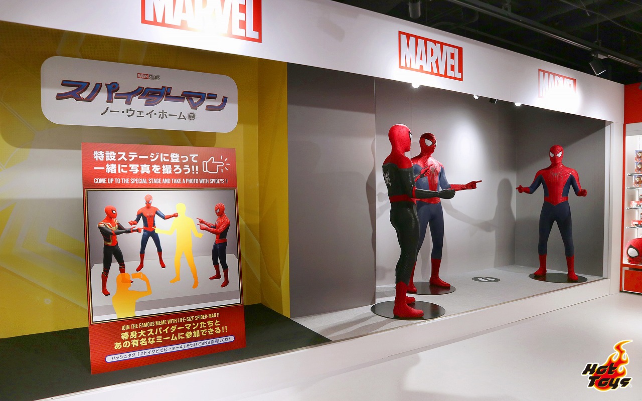 店内の特設ステージに、映画 『スパイダーマン ノー・ウェイ・ホーム』に登場するスパイダーマン(ピーター1・2・3)が、あの有名な 指を差し合うネットミームを再現したポーズで登場