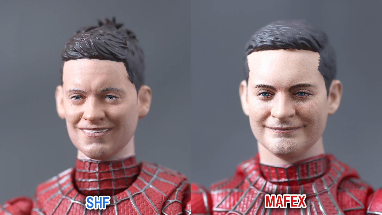 参考までフィギュアーツのピーター・パーカーヘッドと比較。アーツは眉毛が薄いですが、これも悪くはないんですよね。MAFEXは色もはっきりしているので、その点は良さげ。
