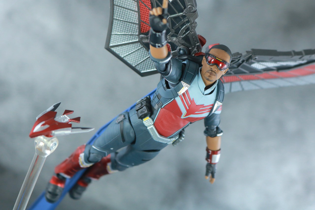 参考までにS.H.フィギュアーツ ファルコン(『ファルコン&ウィンター・ソルジャー』)と比較。サム・ウィルソンの最後のファルコンとしての姿ですね。やはりフィギュアーツはスタイルがより自然です。サムのキャプテン・アメリカはアーツ化しないのかな?
