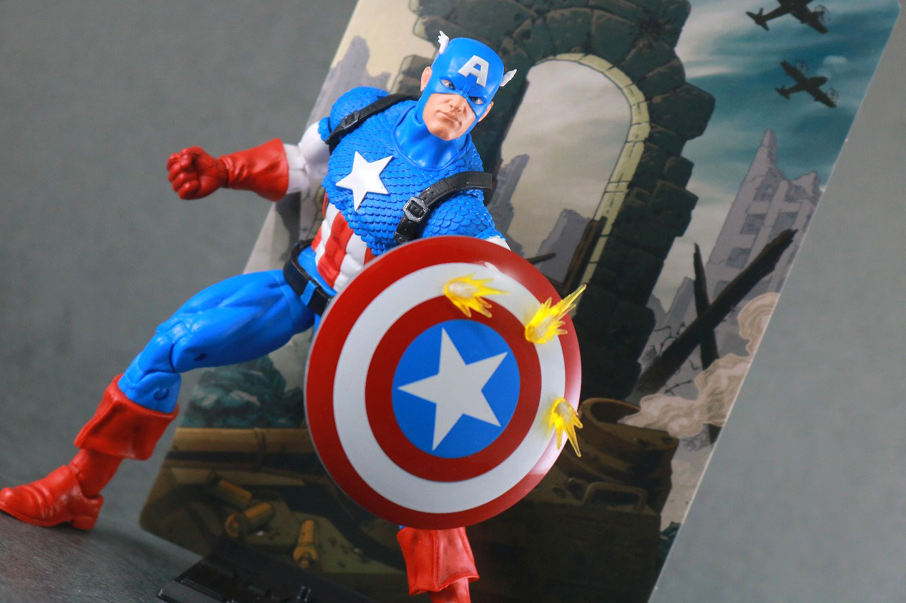 素体はいままでのアイアンマンのコミック版のものを一部使用しながらも、変化のあるところもあったので、差別化はされていましたね。またビビットなイエローとレッドの組み合わせもいかにもコミックらしくて好みな色でした。可動域は広めで、エフェクトパーツもあり、さらにはトニー・スタークの素顔もあるので、アイアンマン本体だけでも十分に遊べます。またマーベルレジェンドのロゴの台座や背景シートもあるので、それもまた楽しめるところですね。