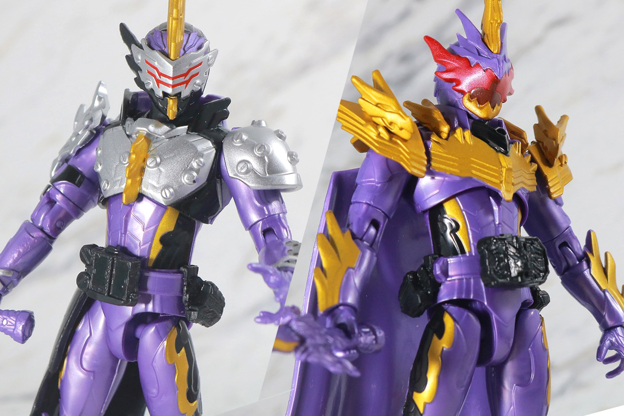 RKFの仮面ライダーセイバーと、同じ機構でのフォームチェンジギミックのあるRKF 仮面ライダーアークワン シンギュライズセットと比較。RKFは基本的に素体が共通機構なので、アークワンにあったフォームチェンジギミックをそのまま流用できるのは大変良かった点じゃないかなと思います。