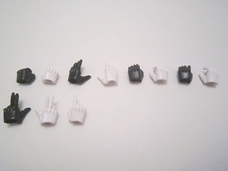 付属品。握り手×2、持ち手2種×2、開き手2種×2、指差し右手×1です。