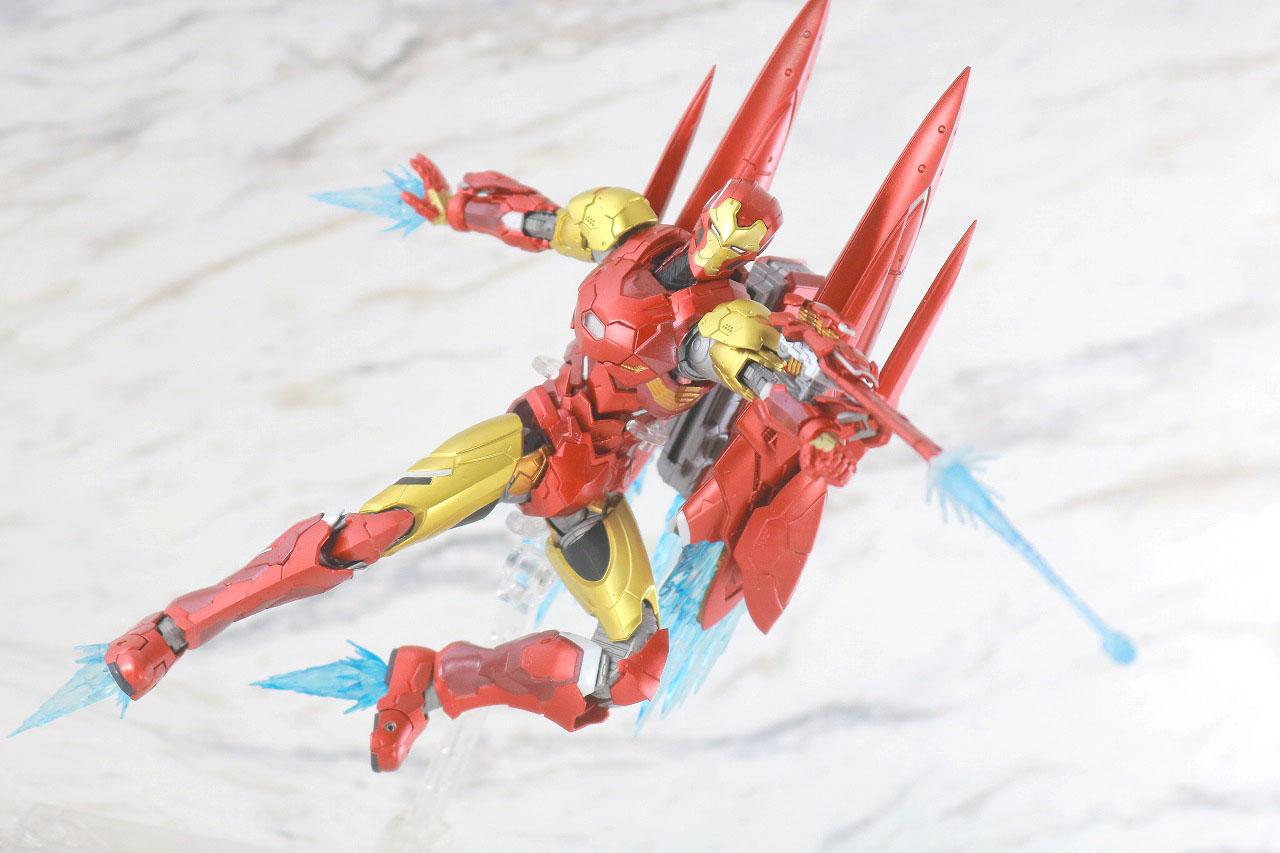 ぐるっと一周。トニー・スタークが作ったスーツということで、キャプテン・アメリカなデザインがされたアイアンマンスーツと言った感じですね。それ言ったらアイアン・パトリオットだろってなりそうですが、そこは上手くキャプテン・アメリカよりなデザインになっているのが素晴らしい。ブルーの部分はメタリック塗装で、赤い部分はマットな塗装になっていますね。特にはみ出しもないので、塗装は良好です。