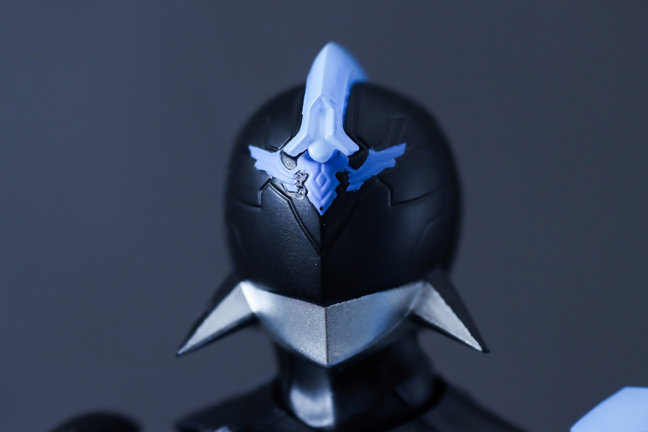バストアップ。特徴的な黒いゴーグル部分と角などもイメージ通りに再現。マットな塗装もきれいですね。後頭部につながるモールドも細かいですし、後頭部自体の模様のデザインも細かい。
