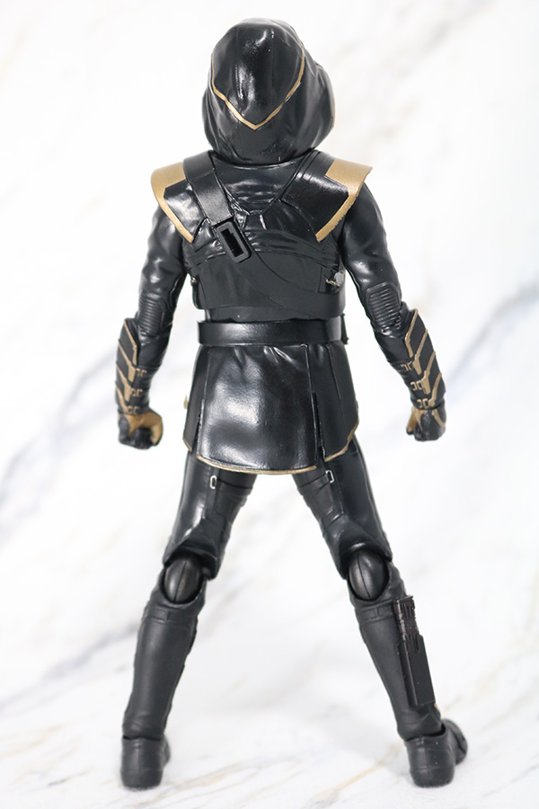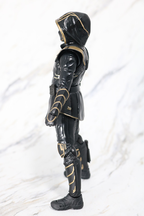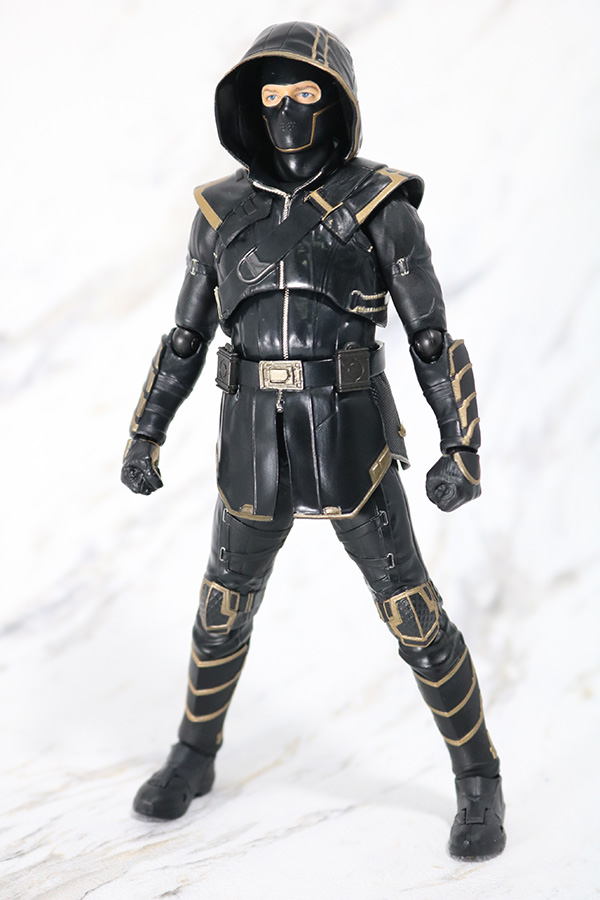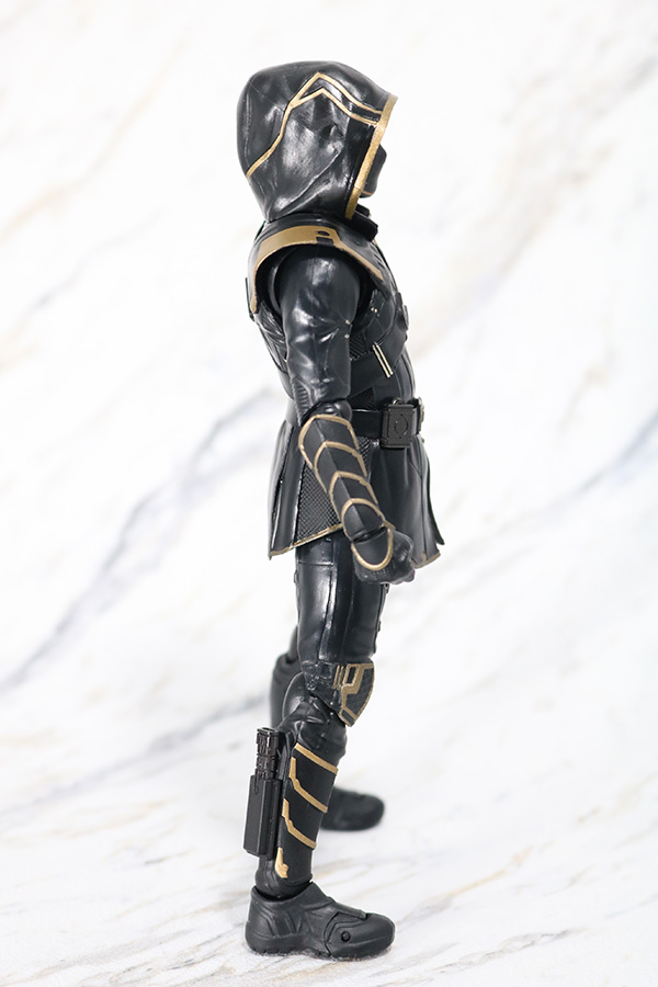 『アベンジャーズ/エンドゲーム』に登場したホークアイことクリント・バートンのもう一つの姿であるローニン。全身真っ黒なスーツにゴールドカラーのラインが引かれているクールなデザイン。スーツの全体的なしわ感は自然ですね。スタイル自体も良好です。