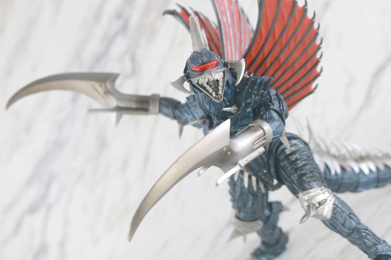 ちなみに以前に再販されたS.H.モンスターアーツのガイガン(2004)大決戦Ver.と比較。角や大きな背びれがあるので、ガイガンの方がボリュームはありますね。