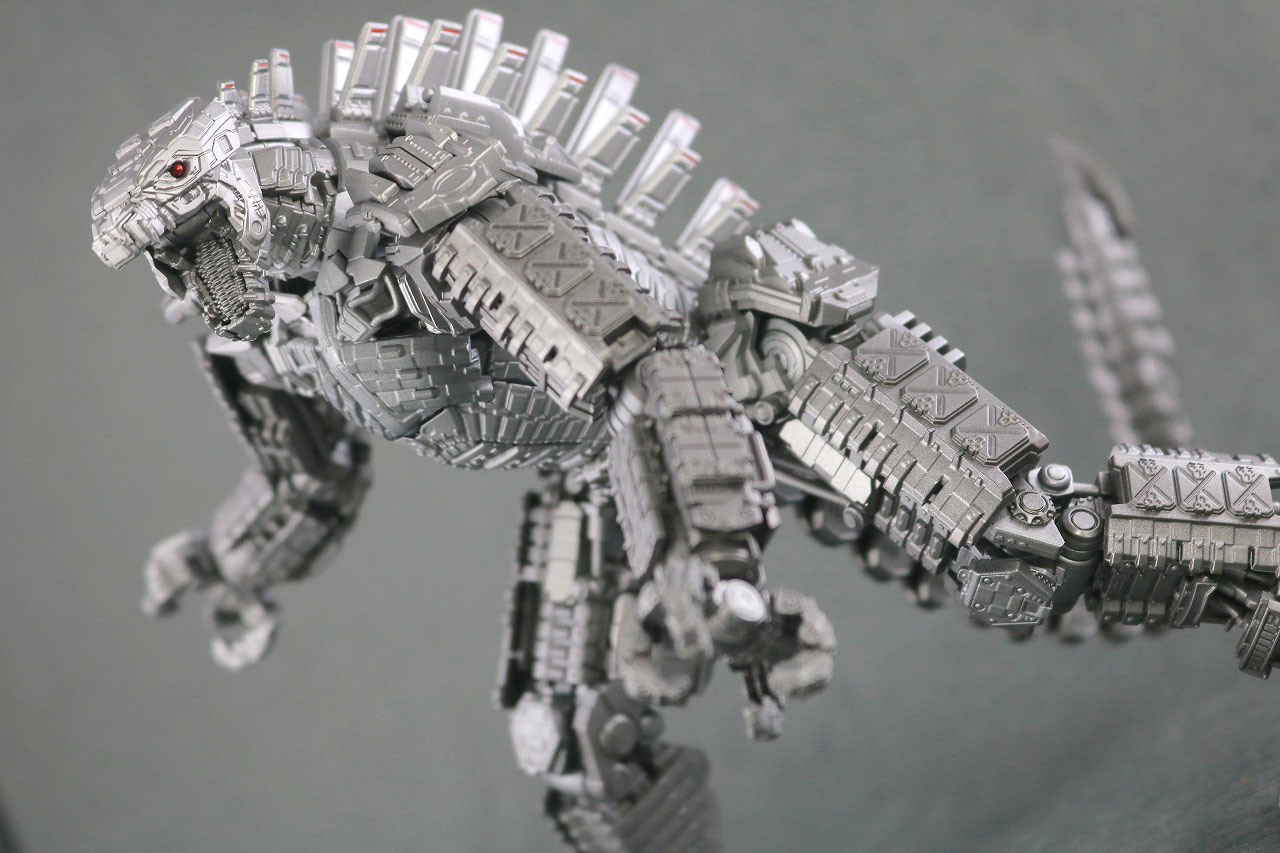 ぐるっと一周。基本的には2021年に発売された通常版のメカゴジラ(2021)と同じ造形ですが、全体的にシルバーのカラーリングが暗くなり、ところどころに赤い塗装も追加されているので、劇中での発光したボディの状態を表現しています。一部ダイキャストが使用されいてるので、ずっしりと重たいです。本体自体もなかなか大きめ。