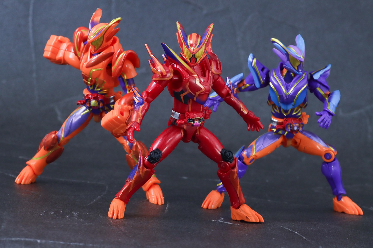 劇中の活躍があまりにインパクトがあったので、これは人気のフォームとなりそうですね。全身真っ赤なボディですが、メタリック感のあるパーツの成形色はキレイで、燃え上がるような雰囲気をよく表現しています。ただ相変わらずシールは多めで、頭部や肩アーマーなどの貼りにくい場所にもシールが多いので、組み立てはやや大変でした。可動については広めなので、ガヴらしいアクションは十分楽しむことができましたね。オーバーモードとマスターモードと並べるのも楽しいので、結構満足しました。