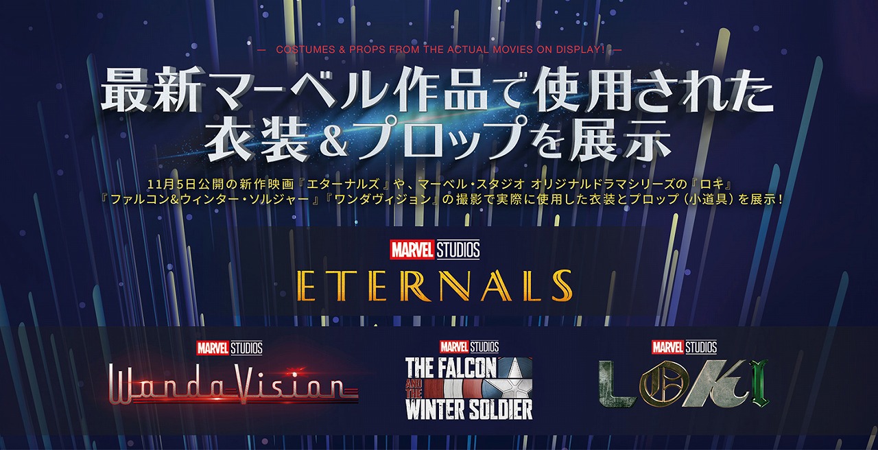 11⽉5⽇(⾦)公開の映画『エターナルズ』や、マーベル・スタジオオリジナルドラマシリーズの『ロキ』『ファルコン&ウィンター・ソルジャー』『ワンダヴィジョン』の撮影で実際に使⽤した⾐装とプロップ(⼩道具)を展⽰!しかも、なんと撮影⾃由!間近で⾒られるチャンスを、ぜひお⾒逃しなく。