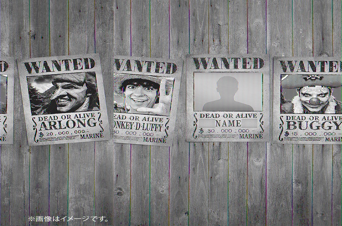 手配書ポスターの名前部分は自由にアルファベットを入れ替えられるので、ルフィやバギーなど劇中の海賊たちの手配書に並んで掲出された、自分自身の手配書を再現できる!